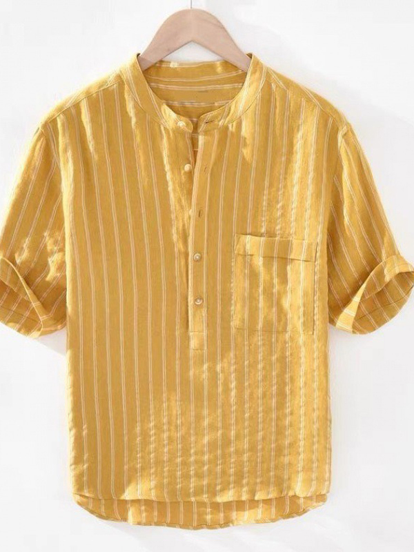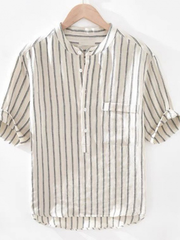 • Men's Casual Striped Print Half Button Pocket Short Sleeve T-Shirt