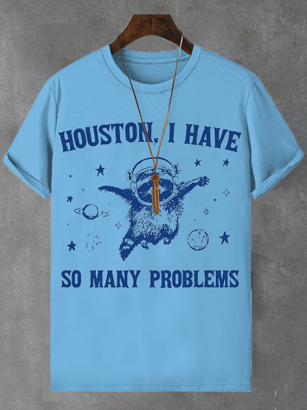 <💯Cotton>Men's Houston I Have So Many Problems Astronaut Cat Art Print Cotton Casual T-Shirt