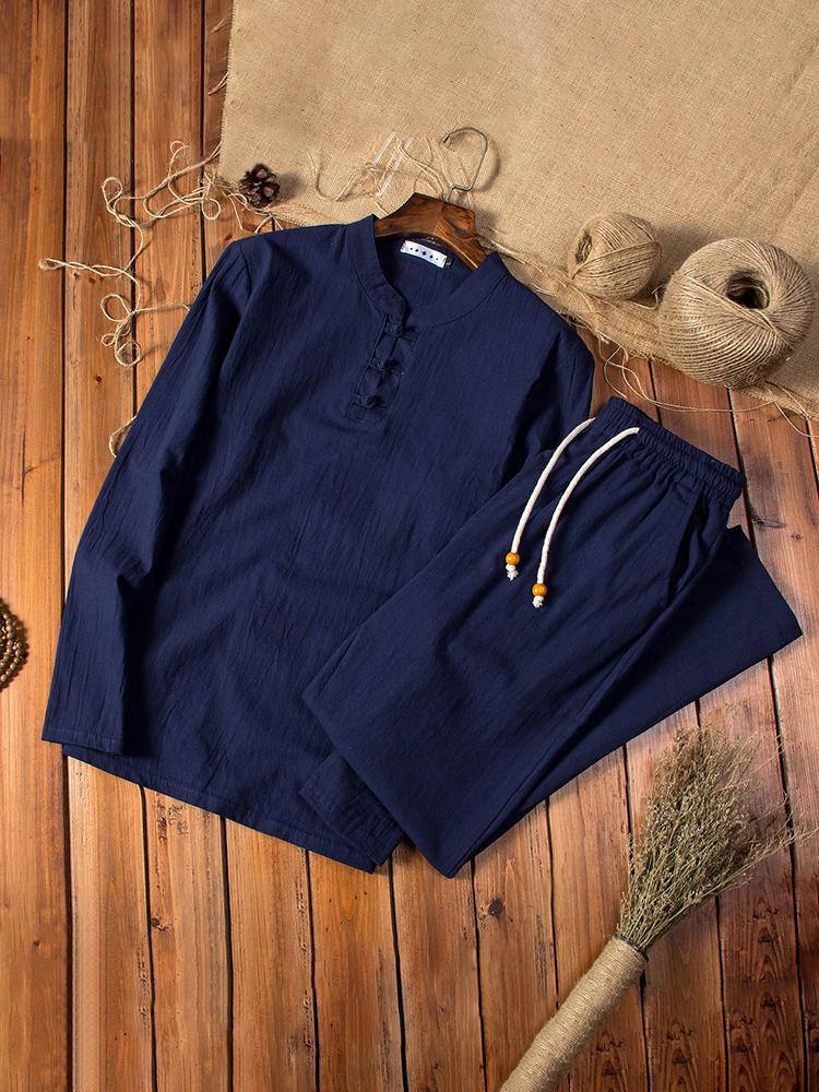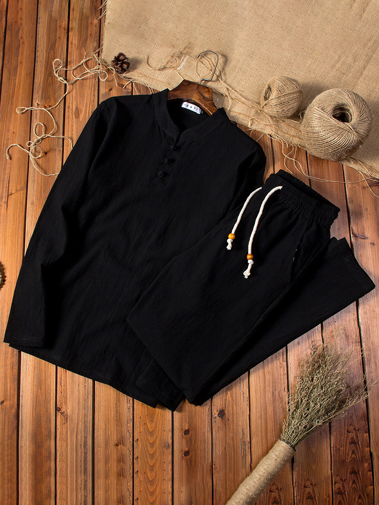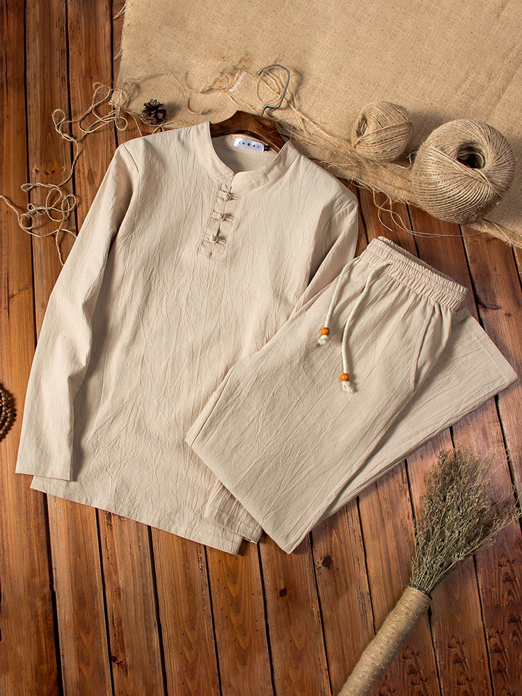 • Men's Solid Cotton Linen Long Sleeve Top Drawstring Pants Matching Set